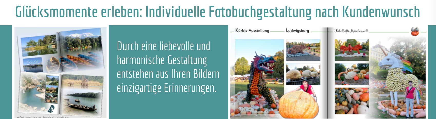 Dann bin ich Ihre richtige Ansprechpartnerin. Ich übernehme sehr gerne die Gestaltung sämtlicher Fotoprojekte.