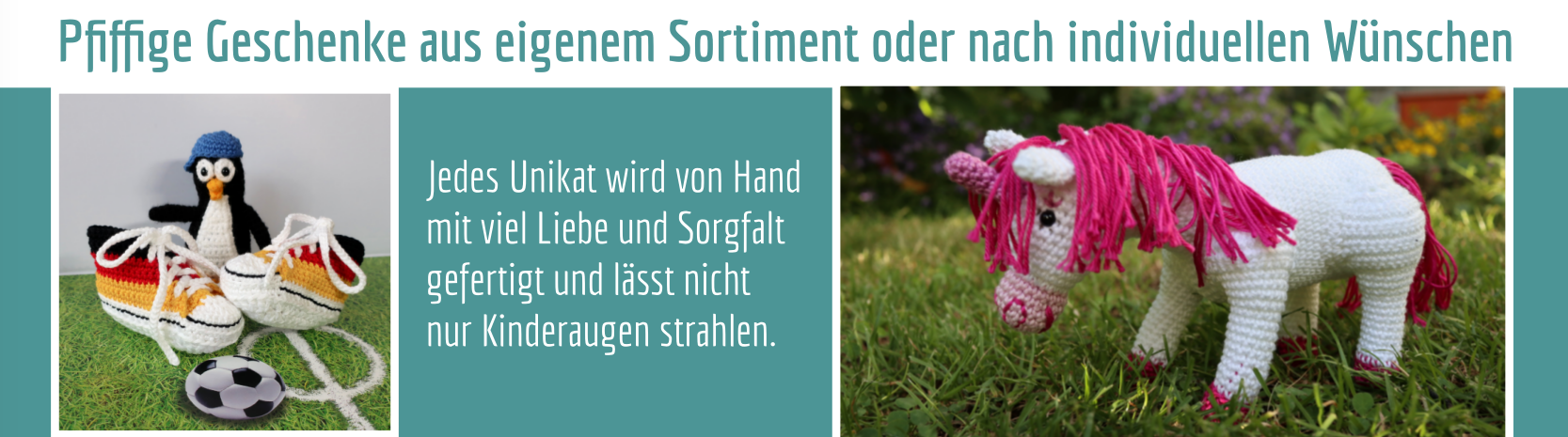 Gehäkelte Kuscheltiere, Deko, Lebensmittel für die Kinderküche, Accesoires, Mützen, Socken, Baby-Chucks uvm